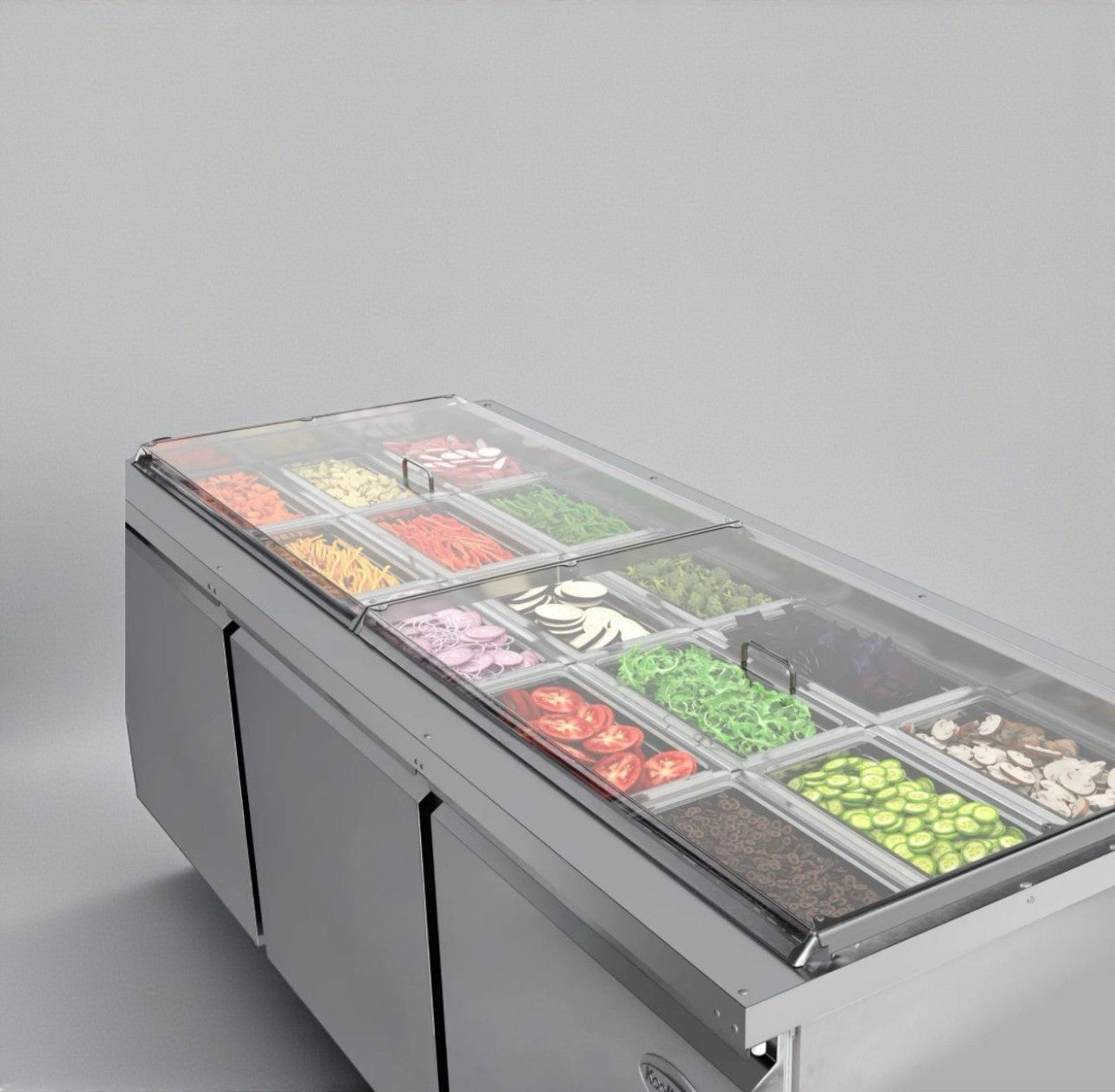The insulated lift-up cover helps maintain safe food temperatures, while the spacious refrigerated base with adjustable shelving provides ample storage for backup ingredients.