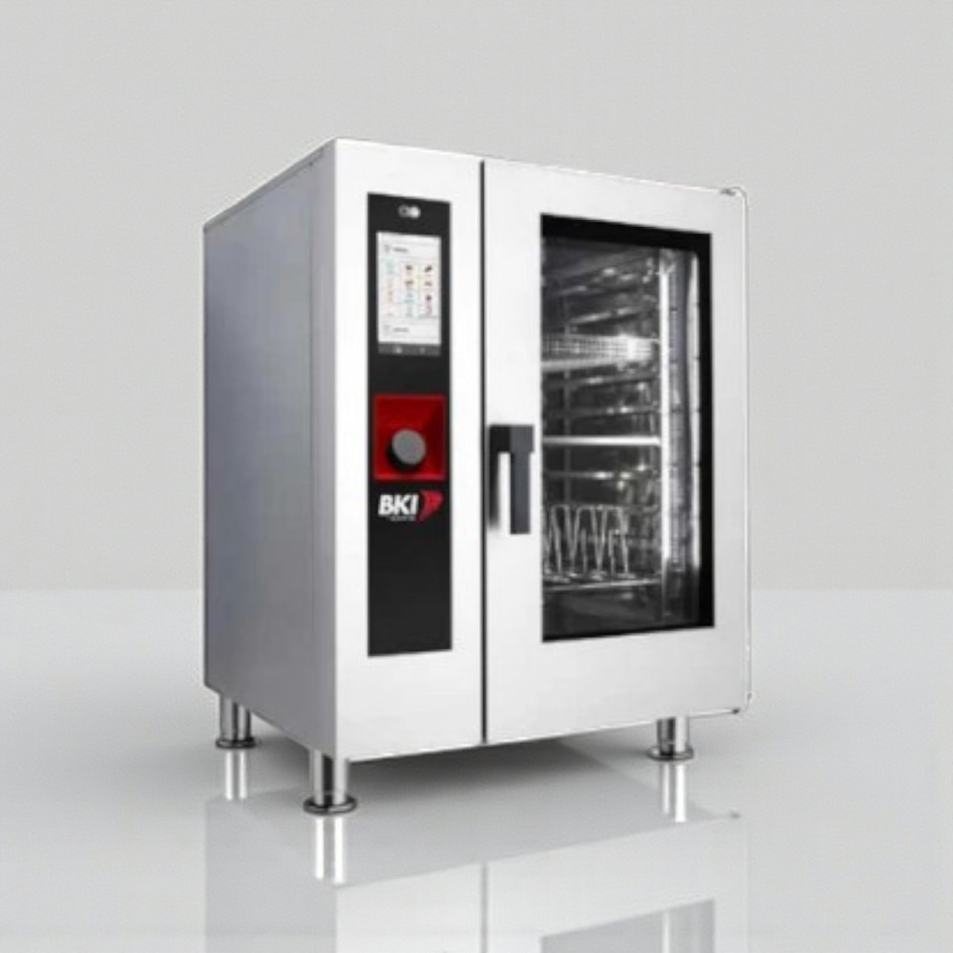 The BKI ETE102R Electric Combination Oven is a high-performance commercial combi oven designed for precise cooking, baking, roasting, and steaming in professional foodservice environments. Featuring boilerless steam generation, this unit delivers consistent humidity control while reducing maintenance and water treatment requirements.