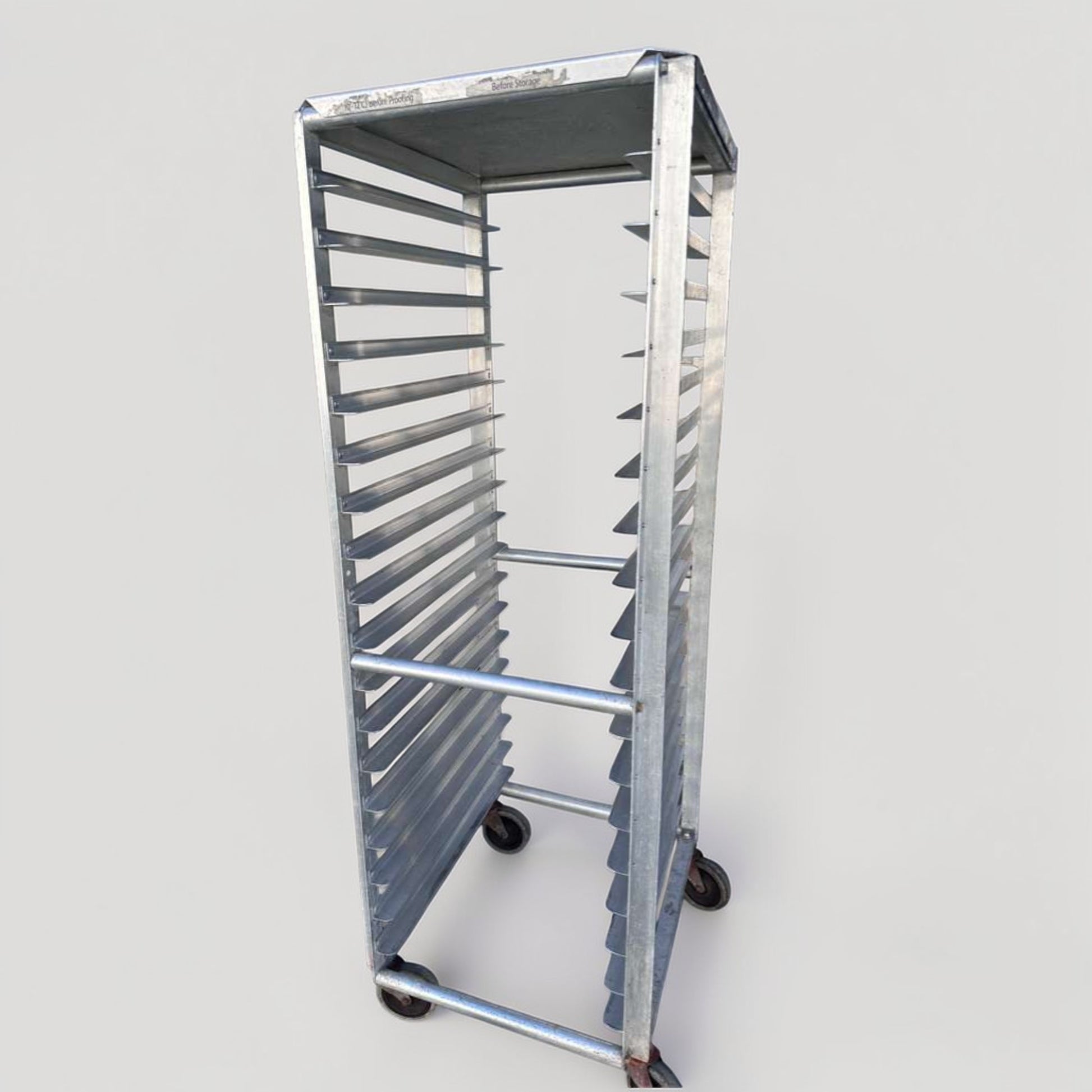 This unit has been professionally inspected to confirm structural integrity and smooth mobility. Aluminum frame is solid with light cosmetic signs of prior commercial use only. Casters roll properly and rack is ready for immediate bakery or kitchen service.