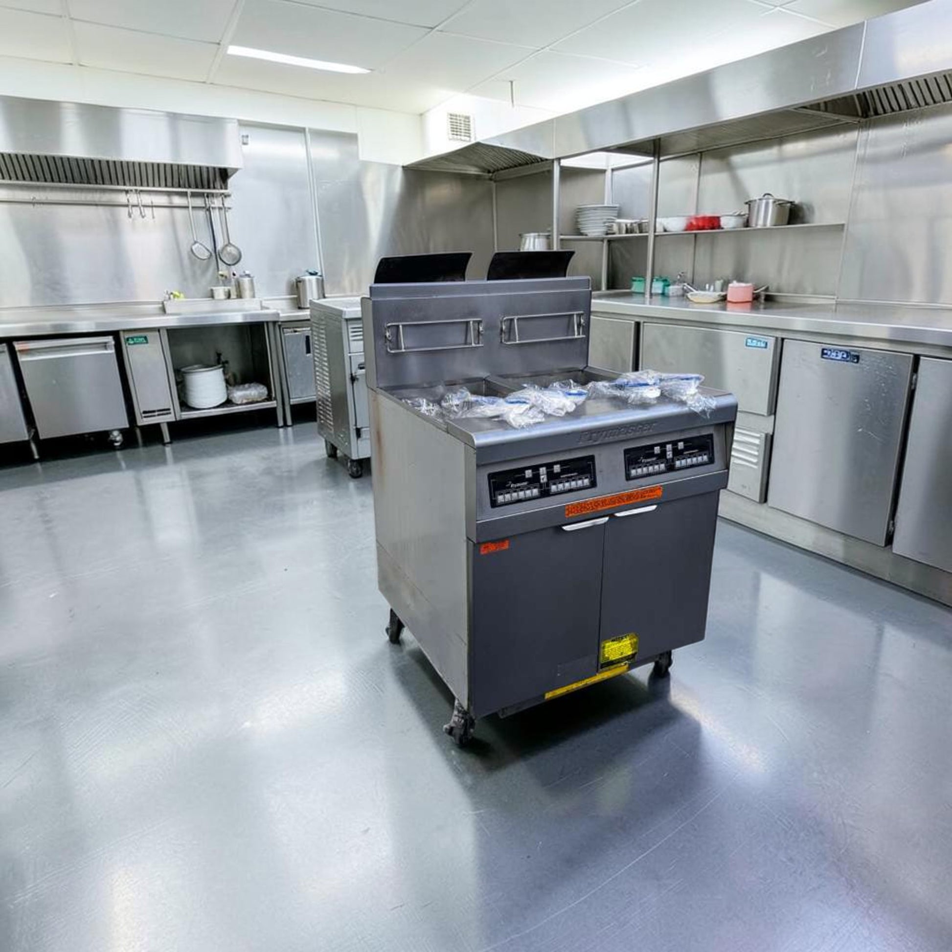 This unit has been professionally inspected and tested to confirm proper operation. Stainless steel exterior is in solid condition with typical cosmetic wear from commercial use. Fryers heat properly and controls function as intended, ready for immediate high-volume kitchen use.