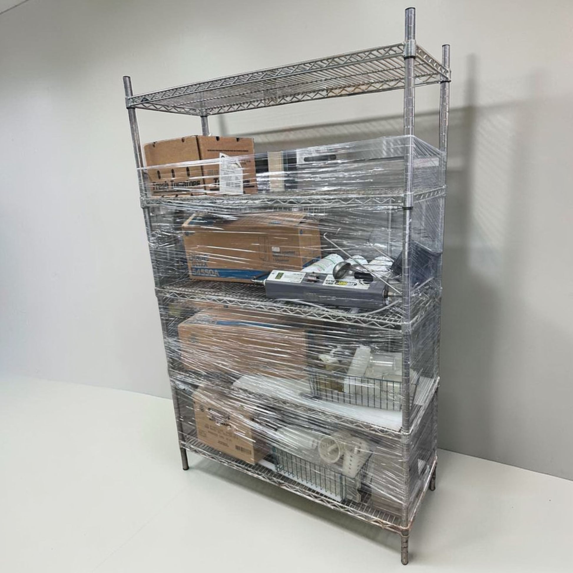 The heavy-duty 4-tier chrome shelving unit provides excellent airflow and high load capacity. Included are assorted restaurant supplies and equipment components visible in photos, making this a high-value liquidation bundle.