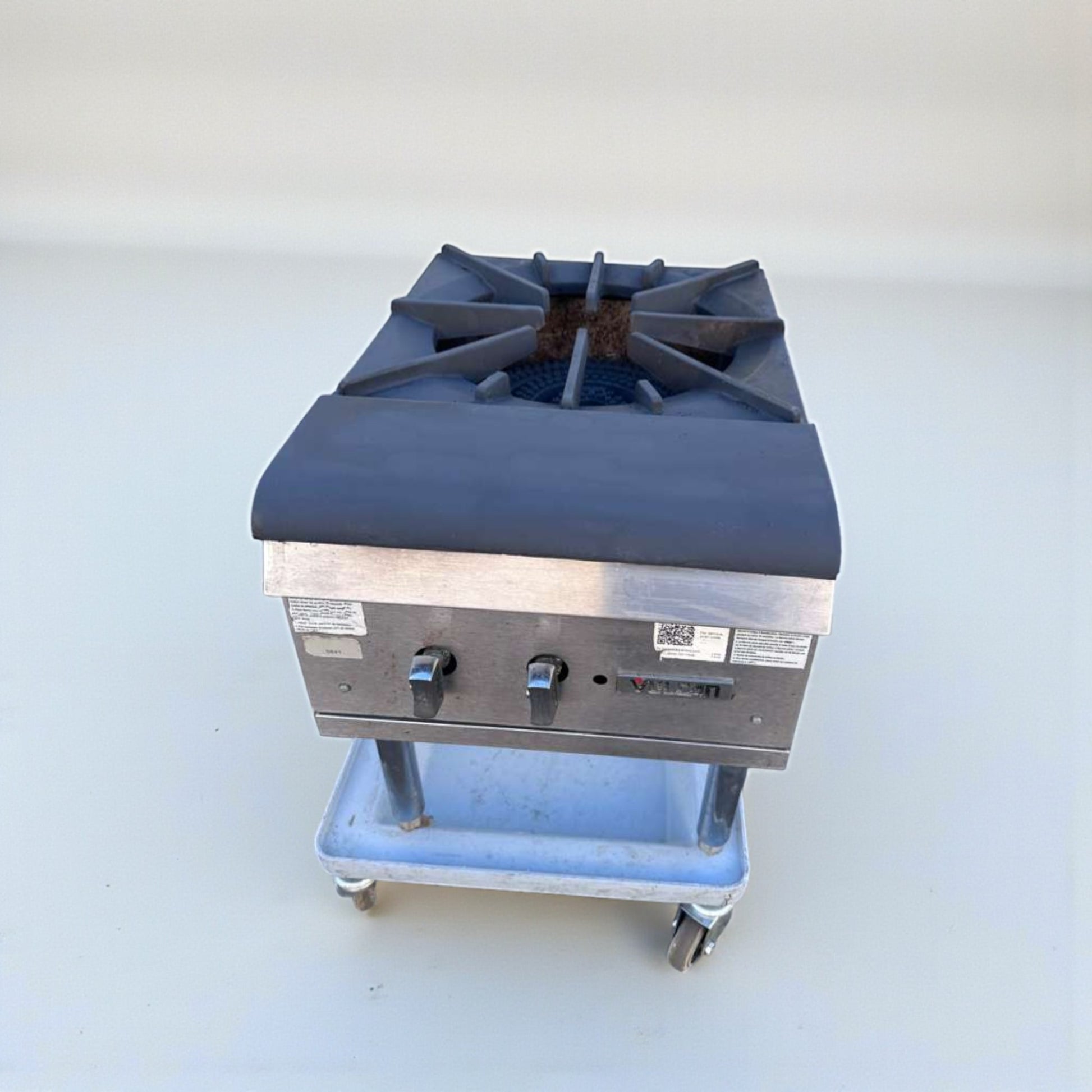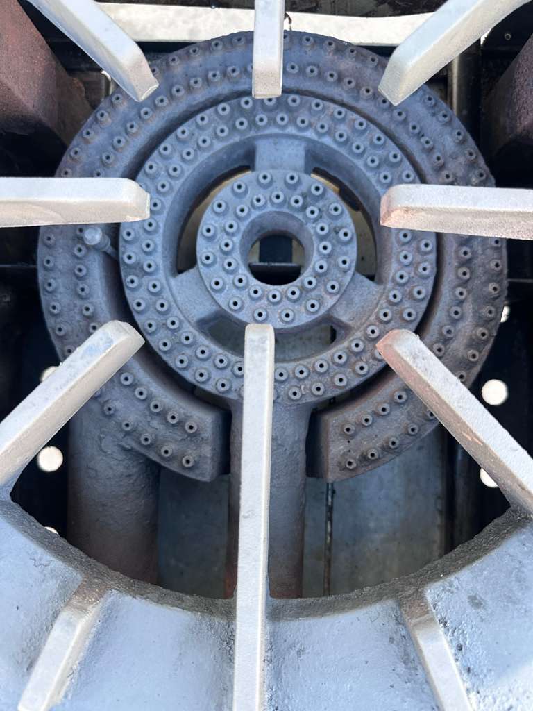 Cast iron burner and grate are intact with normal seasoning and wear consistent with professional kitchen use.